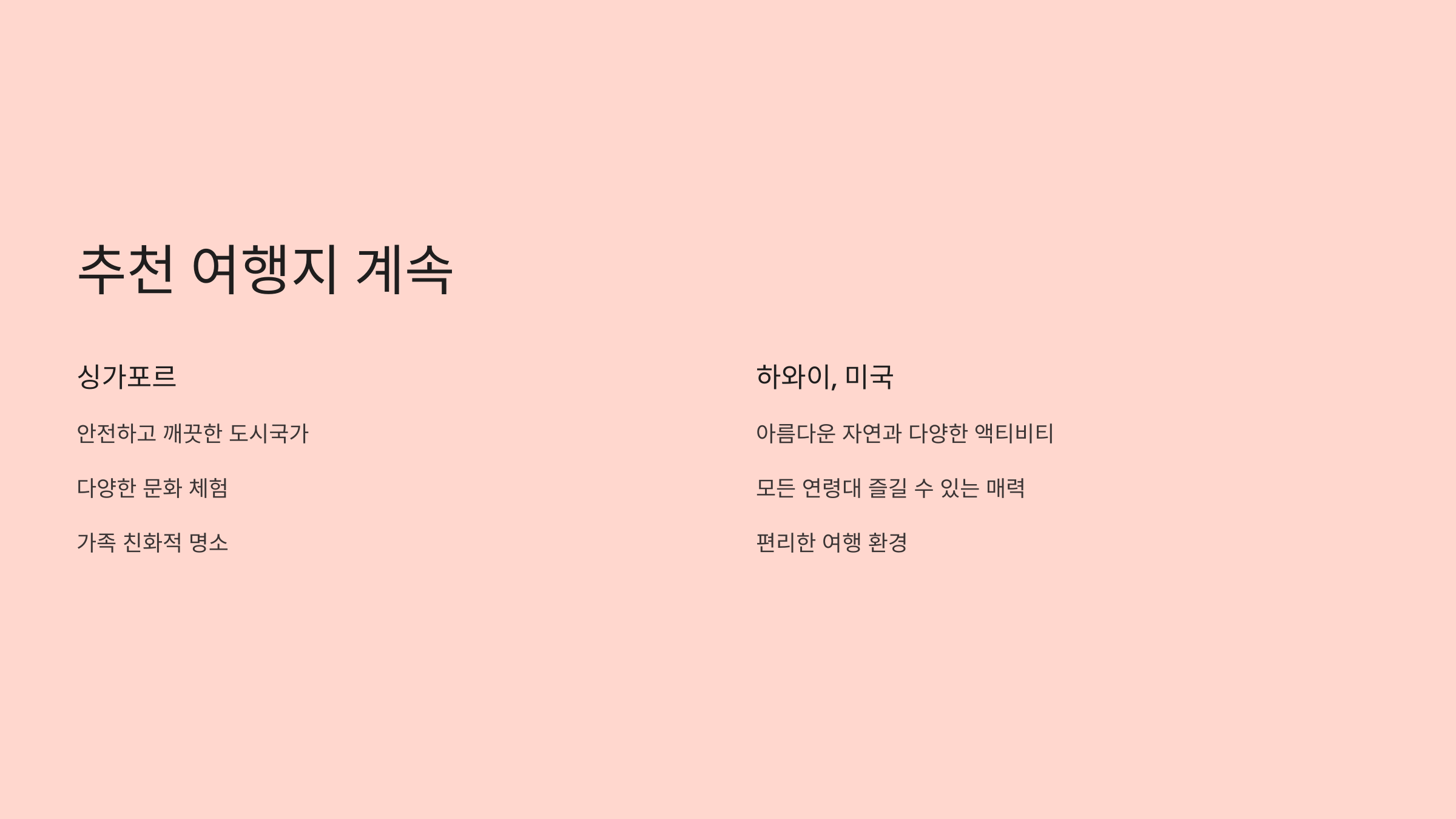 가족과 함께하는 여행은 단순한 관광이 아니라 서로의 소중함을 느끼는 시간이죠. 💖 이번에 소개한 발리, 도쿄, 퀸스타운, 싱가포르, 하와이는 각자 다른 매력을 가지고 있어요. 가족 구성원의 취향과 관심사를 고려해 여행지를 선택해 보세요. 계획만 세워도 이미 여행의 즐거움이 시작된답니다! 🛫